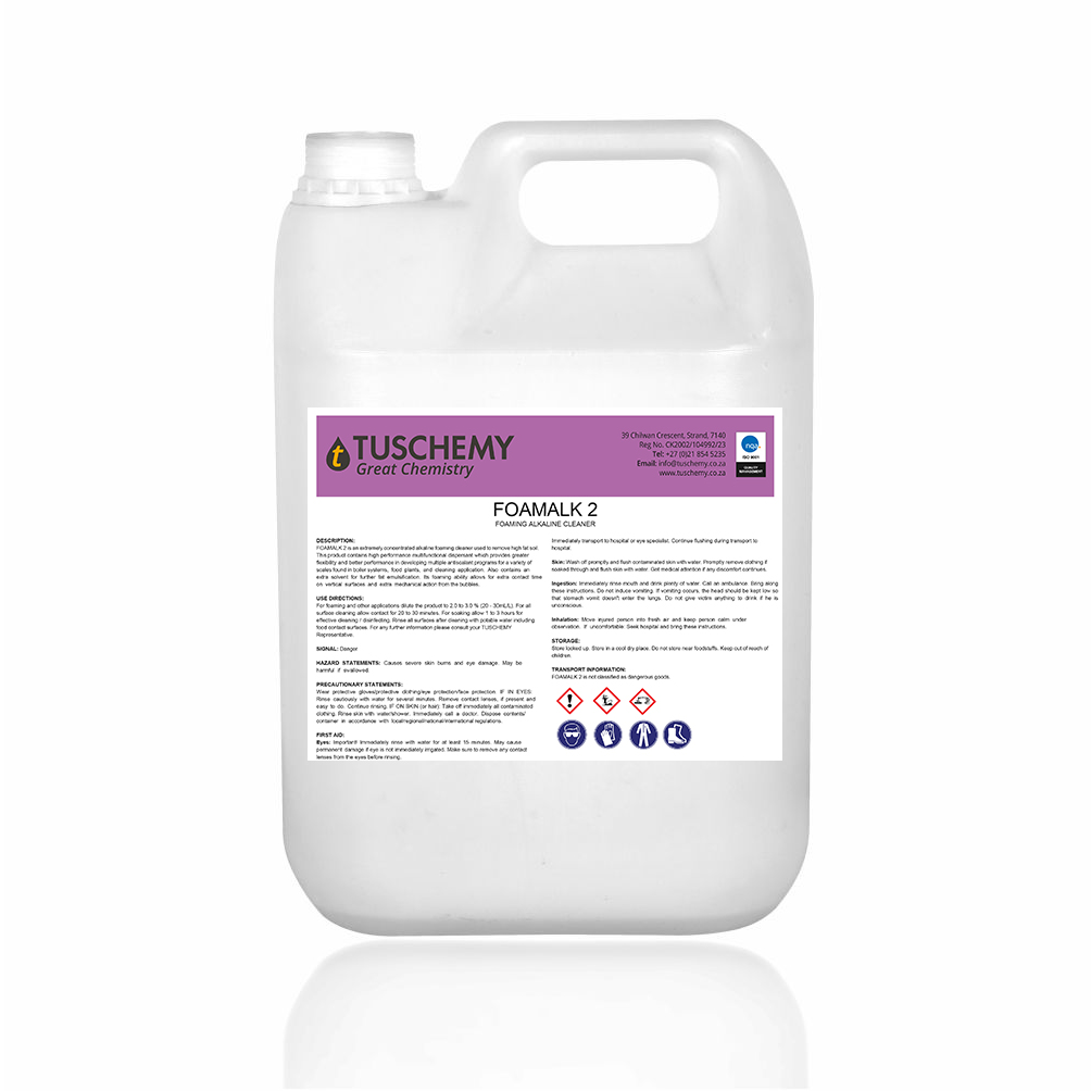 FOAMALK 2 is an extremely concentrated alkaline foaming cleaner used to remove high fat soil. This product contains high performance multifunctional dispersant which provides greater flexibility and better performance in developing multiple antiscalant programs for a variety of scales found in boiler systems, food plants, and cleaning application. Also contains an extra solvent for further fat emulsification. Its foaming ability allows for extra contact time on vertical surfaces and extra mechanical action from the bubbles.