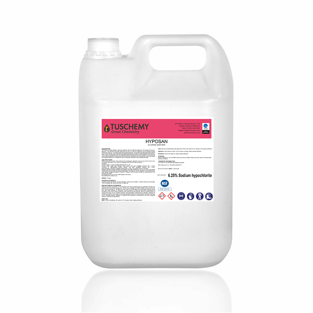 HYPOSAN is highly effective chlorine sanitizer which is effective against a wide range of micro-organisms. This product has been approved by NSF for use as a sanitizer on all surfaces always requiring a rinse (D1) in and around food processing areas. This product has also been approved for use in meat, poultry, and other food processing areas as a Chlorine water treatment product(G4), when used in accordance with the respective label instructions and use limitations. It may also be used in all processing of meat and poultry plants at concentrations up to 5 parts per million calculated as available chlorine. It is suitable for use in industrial, domestic, and institutional areas.
