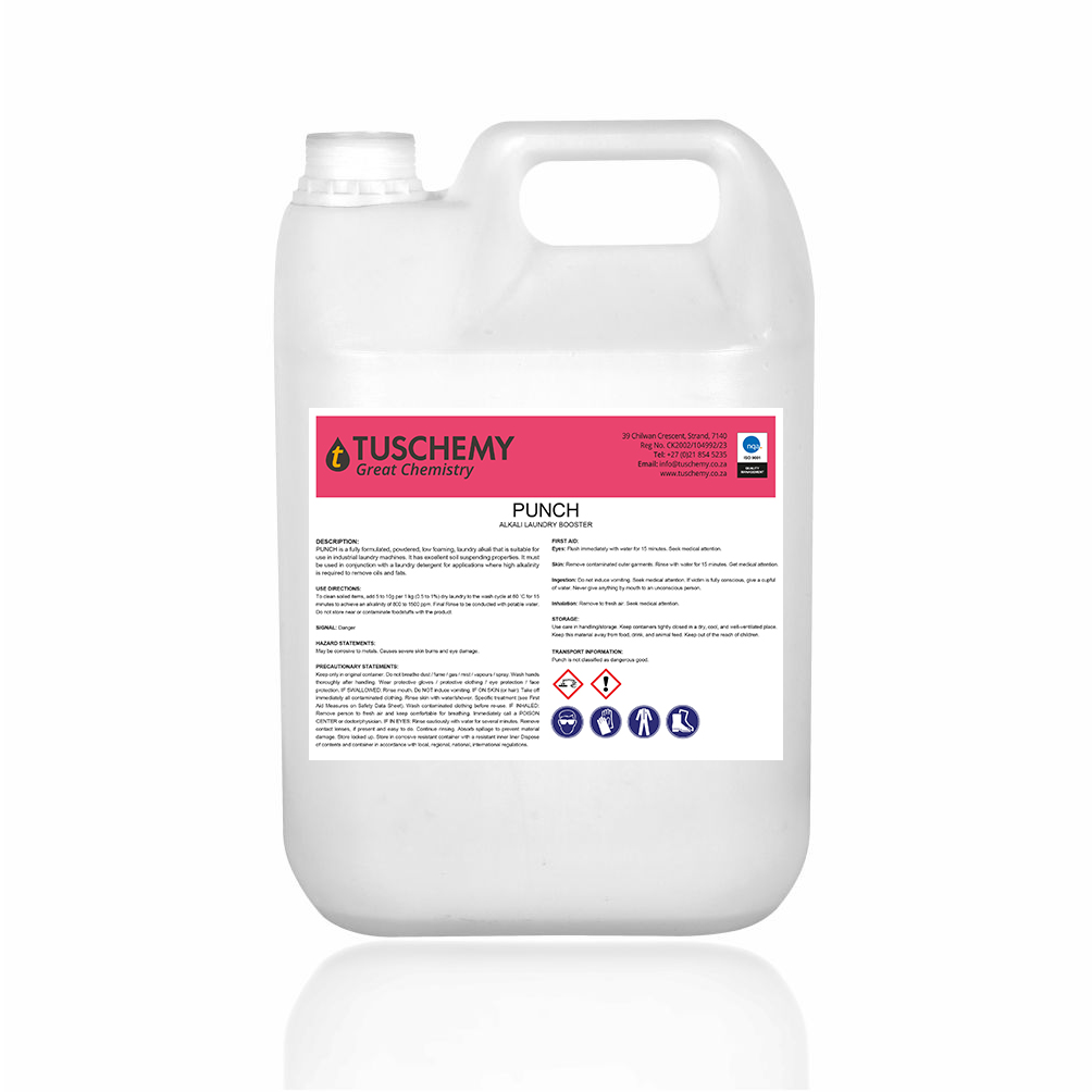 PUNCH is a fully formulated, powdered, low foaming, laundry alkali that is suitable for use in industrial laundry machines. It has excellent soil suspending properties. It must be used in conjunction with a laundry detergent for applications where high alkalinity is required to remove oils and fats.